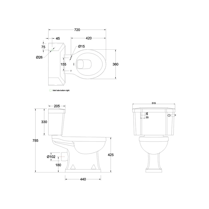Water Inlet valve hole is located on the base of cistern tank on the right hand side