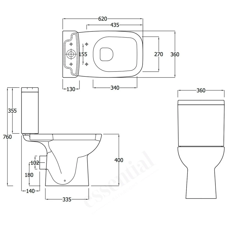 Pan Projection: 620mm, Height: 400mm, Overall Height: 760mm, Pan Width: 350mm, Cistern Width: 360mm