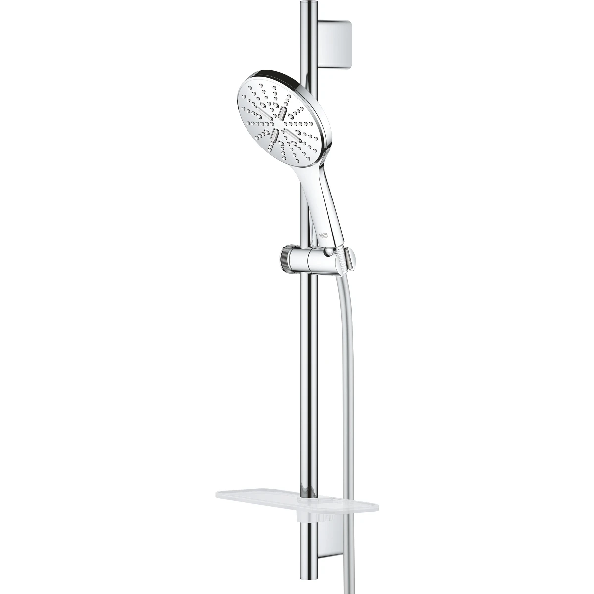 The sleek and stylish Grohe Rainshower 130 SmartActive hand shower comes with a TwistFree Silverflex shower hose (1750mm), matching rail (600mm) and a Grohe EasyReach tray to organize your shower space. It is also packed with innovative technology. Grohe SmartTip – an ergonomic controller on the rear of the handle – gives you fingertip control of the spray pattern: pulsating Grohe ActiveMassage spray, which delivers a whole new level of revitalising massage power, invigorating Jet Spray and Rain Spray – as gentle as warm summer rain. As soon as you turn the water off Grohe DripStop ensures there are no annoying drips from Rain and Jet spray. Thanks to Grohe DreamSpray, the flow from every nozzle has a perfectly balanced flow for maximum satisfaction, and the silicone anti-lime SpeedClean nozzles are extra easy to clean too. The scratch resistant Grohe StarLight chrome finish will stay looking pristine for years and the Inner WaterGuide prevents the surface from getting too hot, protecting both your skin, and the sparkling chrome finish. Installation is incredibly easy too – the Grohe QuickFix Plus system ensures you can use existing holes while Grohe TileFix gives you the flexibility to alter the depth of each bracket to create a perfect fit, ideal for partially tiled bathrooms.