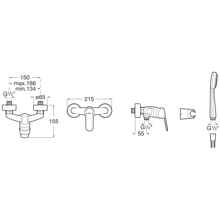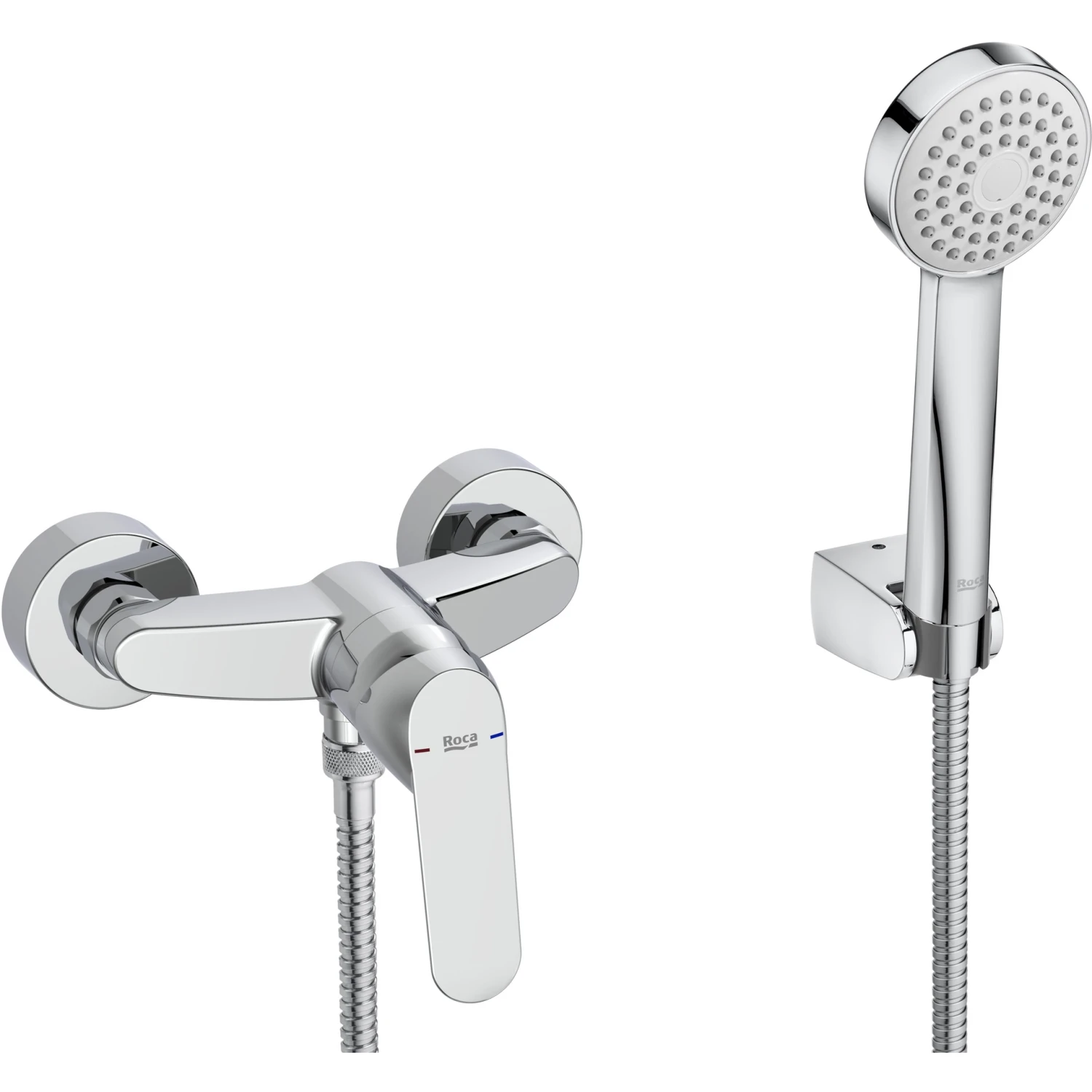 Roca Alfa wall mounted shower mixer with 1.5m flexible shower hose, handshower and swivel wall bracket